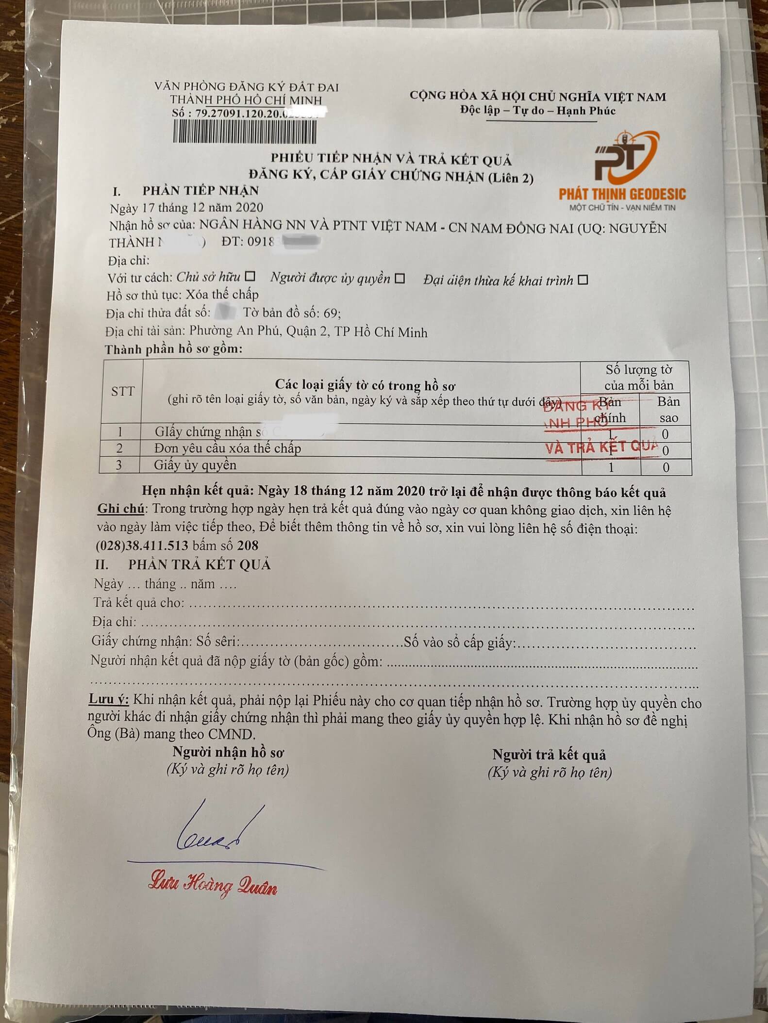 Và cụ thể là ngày hôm nay (tức ngày 17/12/2020 ), một vị khách hàng của một doanh nghiệp đã tìm kiếm qua mạng google về dịch vụ xóa thế chấp sổ đỏ nhanh và biết tới công ty đo đạc Phát Thịnh.