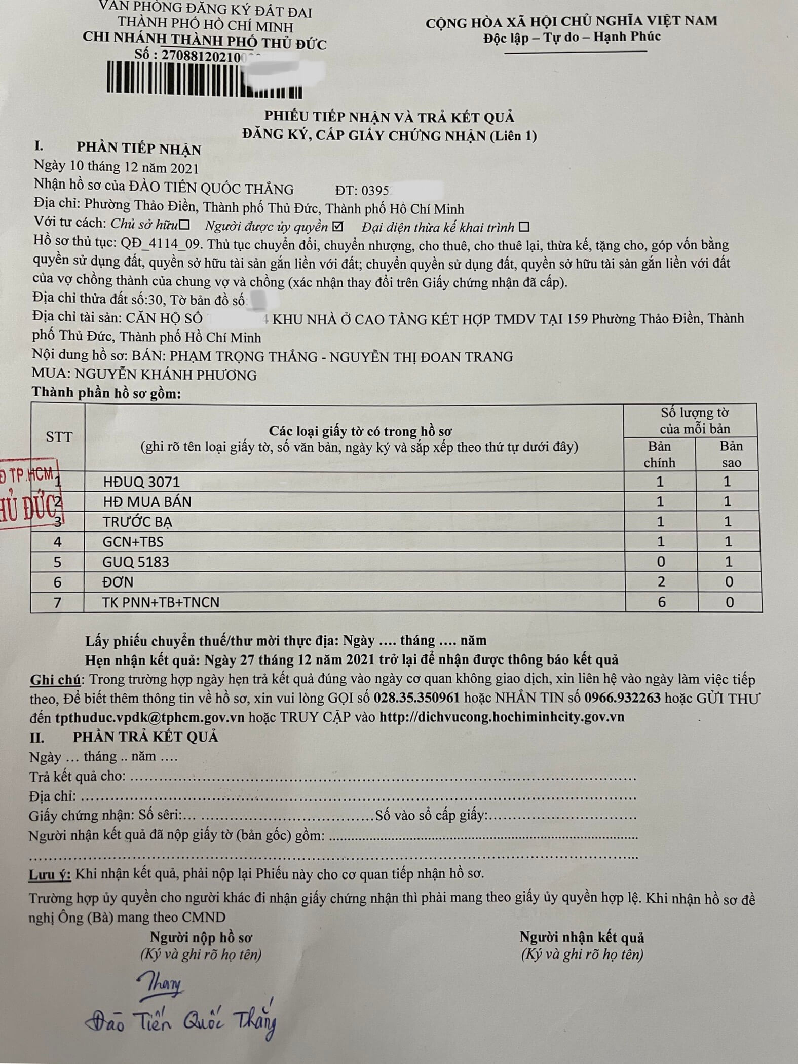 Ngày trả kết quả : 21.12 (sổ hồng đã được sang tên và gửi tới khách hàng)